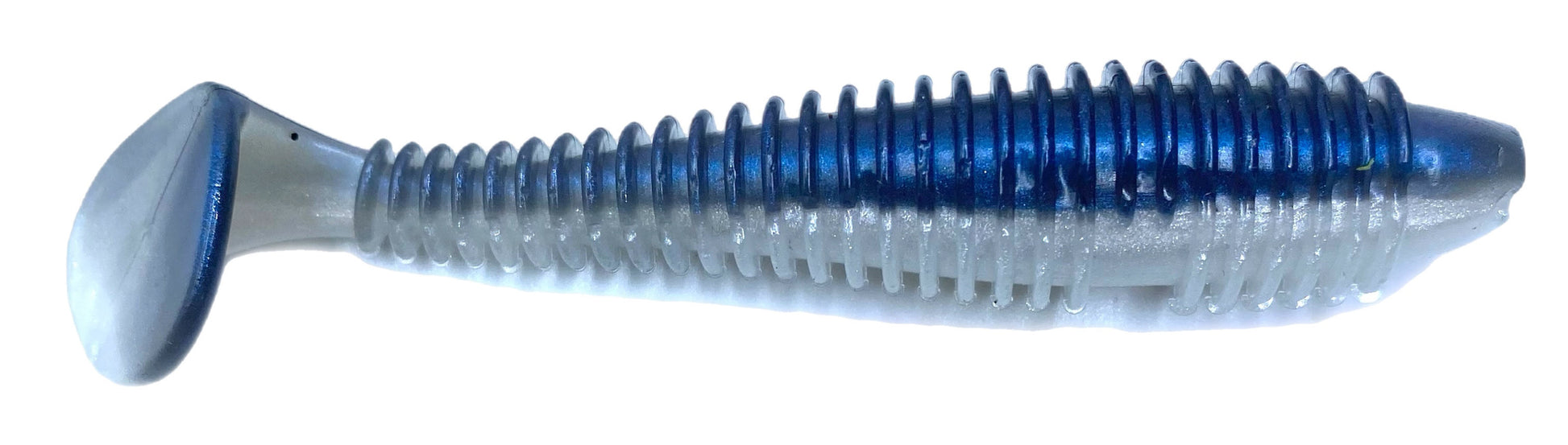 Bait Design: The body shape starts with a rounded nose, moves back into a ribbed body, and tapers off into the paddle tail. the length is 3.3"
